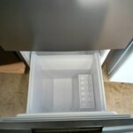 実際に確認したところ、外観のドア表面には使用による細かな擦れや小さな傷が複数見られました。ただし大きなへこみや破損はなく、日常使用による範囲の使用感でした。庫内はガラス棚や野菜ケースも揃っており、内部は比較的清潔な状態を保っていました。冷却機能も問題なく、冷蔵室・冷凍室ともに正常に動作することを確認しました。