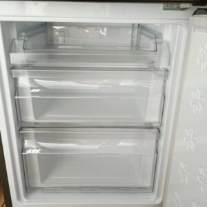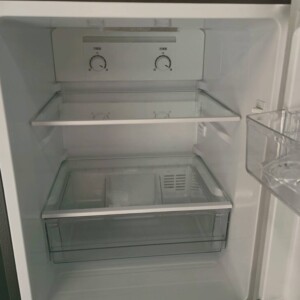 実際に拝見したところ、外装には細かな使用に伴う小傷はあるものの大きなへこみなどはなく全体的にきれいな状態でした。庫内のガラス棚や野菜ケース、冷凍室の引き出しもすべて揃っており、内部も丁寧に清掃されていました。温度調整ダイヤルの動作や冷却状況も確認し、冷蔵室・冷凍室ともに問題なく稼働していることを確認できました。2022年製と比較的新しい年式である点も評価につながりました。
