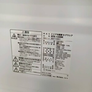 拝見したニトリ 2ドア冷蔵庫 NTR-106BKは2023年製の比較的新しいモデルで、全体的にきれいな状態でした。外観には日常使用による軽微な擦れは見られましたが、目立つへこみや大きな傷は確認されませんでした。