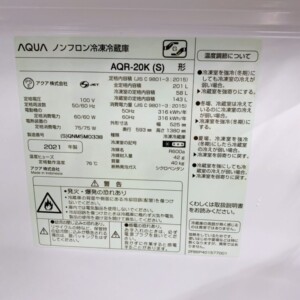 今回は武蔵野市吉祥寺にお住まいの30代女性・会社員・単身世帯・賃貸(マンション)のお客様より、AQUA ノンフロン冷凍冷蔵庫 AQR-20K(S)(2021年製)を出張買取にてご依頼いただきました。容量201Lの2ドアタイプで、一人暮らしから二人暮らしまで幅広く使われる実用的なサイズの冷蔵庫です。引っ越しに伴い不要となったため、出張買取のご相談をいただきました。