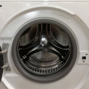 お預かりしたND100KL1WHは、外観に目立つキズやヘコミが見られないきれいな状態でした。ドラム式特有の大きなガラス扉も透明感があり、目立つ曇りや傷は確認されませんでした。洗濯槽内部も清潔感があり、洗剤残りやカビの付着などは見られませんでした。