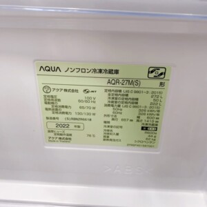 今回は東京都稲城市にお住まいの40代女性(主婦・夫婦世帯・持ち家(マンション・分譲マンション))より、AQUA ノンフロン冷凍冷蔵庫 AQR-27M(S)(2022年製)の出張買取をご依頼いただきました。
