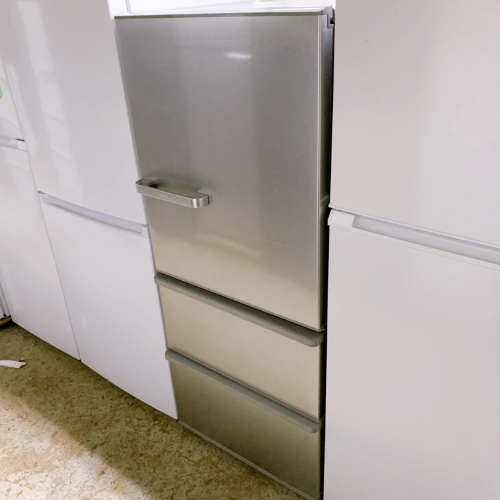 拝見した商品はAQUA製の3ドア冷凍冷蔵庫 AQR-27M(S)で、外観はシルバー系カラーの落ち着いたデザインです。扉部分にわずかな使用による擦れは見受けられましたが、大きなへこみや目立つ傷はなく全体的に良好なコンディションでした。
