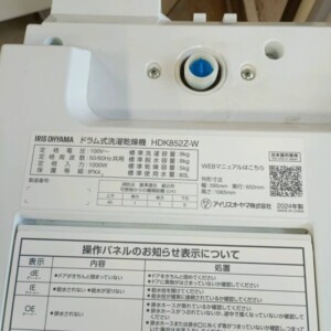 東京都東大和市へ出張買取 IRIS OHYAMA HDK852Z-W 2024年製 ドラム式洗濯乾燥機 きれいな状態のため適正価格で査定しました