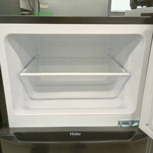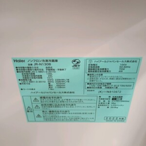 HaierのJR-N130Bは一人暮らし用冷蔵庫として中古市場でも流通量が多く、需要が安定しているモデルです。今回の商品は2022年製で比較的新しく、外観や庫内の状態も良好で、棚やケースなどの付属品も揃っていました。