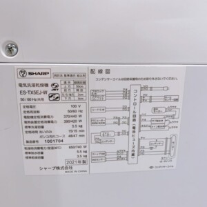お引き取りした商品はSHARP(シャープ)洗濯乾燥機 ES-TX5EJ-Wで、洗濯容量5.5kg・乾燥容量3.5kgの縦型タイプの洗濯乾燥機です。省スペースでも設置しやすいサイズで、単身者や二人世帯の家庭で多く利用されているモデルです。