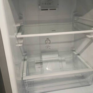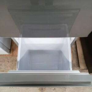 庫内についても棚板・ドアポケット・野菜ケースなどのパーツが揃っており、透明パーツの割れや破損は見られません。内部も清掃状態が良く、冷却動作も正常に確認できました。冷凍室の引き出し部分も破損はなく、中古品として再販可能なコンディションでした。