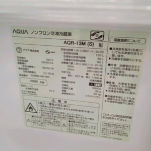 今回は中央区日本橋にお住まいの40代女性(主婦・夫婦世帯・持ち家(マンション・分譲マンション))より、AQUA ノンフロン冷凍冷蔵庫 AQR-13M(S)(2022年製)を出張買取にてご依頼いただきました。