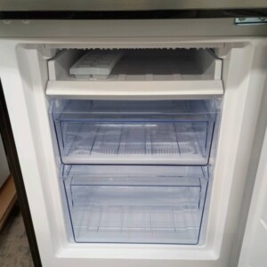 庫内についても確認したところ、ガラス棚やドアポケット、野菜ケース、冷凍室の引き出しなどの備品はすべて揃っており破損もありません。内部の汚れも少なく、丁寧に使用されていたことが分かる状態でした。冷却動作も正常で、中古品として再販売可能なコンディションであることを確認しました。