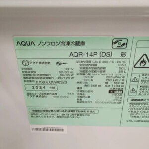 今回査定した商品はAQUA(アクア)ノンフロン冷凍冷蔵庫 AQR-14P(DS)で、2024年製・容量135Lの2ドアタイプです。単身世帯やセカンド冷蔵庫として需要の高いサイズ帯のモデルとなっています。