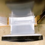実際に確認したところ、本体外観には使用に伴う細かな擦れや軽微な傷が見受けられましたが、大きなへこみや破損などはありませんでした。庫内は棚板やドアポケットなどのパーツが揃っており、全体的にきれいな状態が保たれていました。冷蔵室の棚やケース部分も割れなどは見られず、通常使用に問題ない状態でした。