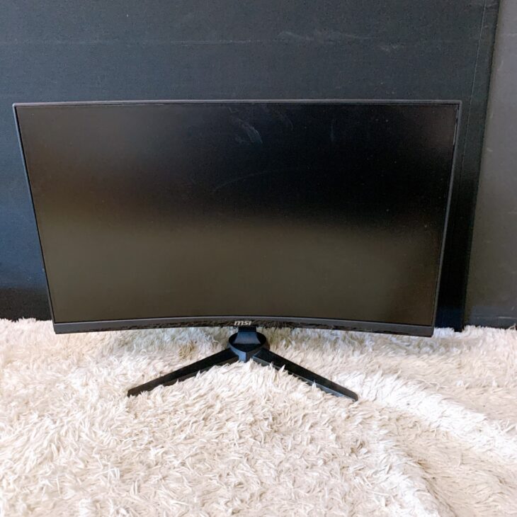 今回拝見したお品物は、MSIの湾曲ゲーミングモニター G243CVです。写真で確認できる範囲では、液晶画面に大きな割れや目立つ欠けは見受けられませんでしたが、画面表面には拭き跡や細かなスレがあり、通常使用による使用感が見られました。背面カバーやスタンド部分にも軽微な擦れがあり、新品同様とはいえない状態です。ただし、筐体そのものに大きな破損はなく、スタンドや電源アダプター、接続ケーブル類も付属していたため、再使用に必要な基本構成はそろっていました。