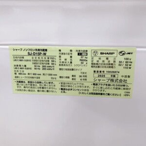 査定した商品はSHARP(シャープ)ノンフロン冷凍冷蔵庫 SJ-D15P-Wです。定格内容積は152Lで、冷蔵室と冷凍室を備えた2ドアタイプの冷蔵庫です。単身世帯や学生の一人暮らし用として人気がある容量帯のモデルで、中古市場でも安定した需要があります。