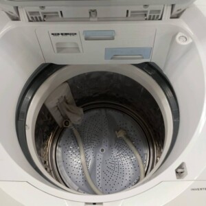 洗濯槽内部については比較的清潔な状態で、洗剤カスやカビなどの強い汚れは見られませんでした。給水ホース・排水ホースも揃っており、動作確認では洗濯・脱水・乾燥機能ともに問題なく作動しました。中古家電として再利用可能な状態であることを確認し、状態を踏まえて査定を行いました。