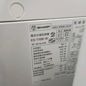 今回は東京都小平市にお住まいの50代女性・主婦(親子世帯/持ち家(一戸建て))のお客様より、SHARP 電気洗濯乾燥機 ES-TX8E-W(2021年製)を出張買取にてご依頼いただきました。