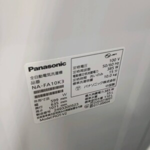 査定した商品はPanasonic(パナソニック)全自動電気洗濯機 NA-FA10K3です。洗濯容量10kgの縦型洗濯機で、ファミリー世帯でも十分に使える大容量タイプのモデルです。洗浄力と節水性能のバランスが良く、家庭用洗濯機として人気の高いシリーズです。