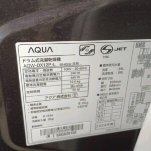 査定した商品はAQUA(アクア)ドラム式洗濯乾燥機 AQW-DX12P-Lです。洗濯容量12kgの大容量ドラム式モデルで、洗濯から乾燥まで対応する家庭用の高機能洗濯機です。ファミリー世帯でも使用できる容量帯で、中古市場でも需要が高い機種のひとつです。