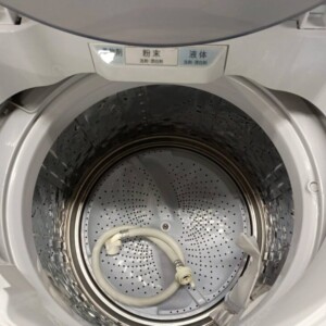 内部の洗濯槽も比較的きれいで、過度なカビ汚れや臭いは見られませんでした。さらに給水ホースなどの付属品も揃っている状態で、再販時にも安心して販売できる内容でした。
