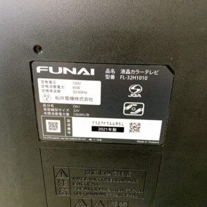 今回拝見したお品物は、FUNAIの32V型液晶カラーテレビ FL-32H1010です。画像から確認できる範囲では、液晶画面に大きな割れや目立つ欠けは見受けられず、全体としては比較的きれいな状態でした。フレームや背面には通常使用にともなう軽微な擦れはあるものの、大きな破損や目立つへこみは確認されていません。また、専用リモコンが付属しており、テレビ本体とあわせて使用に必要な内容がそろっている点も査定しやすいポイントでした。背面ラベルからは型番FL-32H1010、2021年製であることも確認できました。
