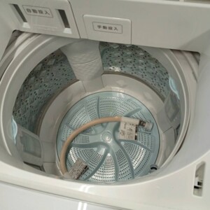 洗濯槽内部も比較的清潔な状態で、カビや強い汚れの付着は確認されませんでした。給水ホースも付属しており、通常使用に必要なパーツは揃っていました。中古洗濯機としてはコンディションの良い状態と判断できました。