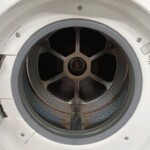 外観は全体的にきれいな状態で、前面パネルやドア部分にも大きな傷やへこみは見られませんでした。洗濯槽内部も比較的きれいな状態で、強い汚れやカビの付着は確認されませんでした。