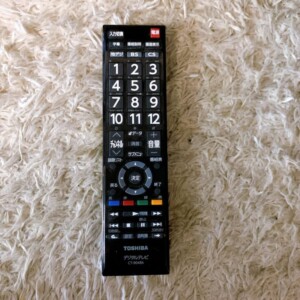 また、付属品として純正リモコン(CT-90486)が付属しており、チャンネル操作や音量調整などの基本操作も問題なく使用できる状態でした。中古テレビとしては標準的な使用感があるコンディションでした。