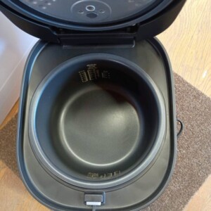 内釜については使用によるわずかな擦れや水滴跡が見られましたが、コーティングの大きな剥がれはなく、炊飯機能に影響のあるダメージはありませんでした。中古家電としては一般的な使用状態のコンディションです。