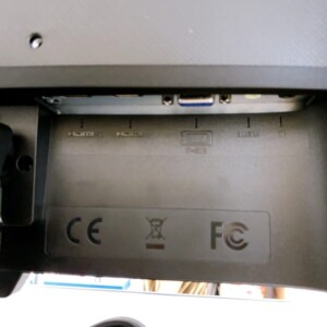 背面部分には設置時に付いたと思われる軽微な擦れが見られましたが、スタンドのぐらつきなどはなく安定して設置できる状態です。電源ケーブルも付属しており、HDMI入力やVGA端子などの接続ポートも確認できました。中古モニターとしては実用性の高いコンディションです。