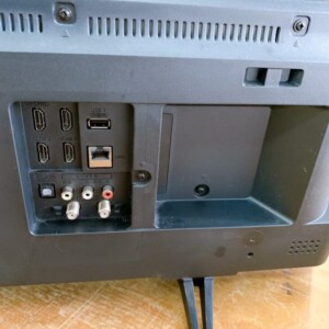 背面部分には配線をまとめるためにテープで固定されていた跡が見られましたが、筐体の破損や大きなダメージはありません。HDMI端子やUSB端子、LANポートなどの接続端子も確認でき、テレビとしての基本機能は問題なく使用できる状態でした。スタンド脚も付属しており、安定して設置できる状態でした。