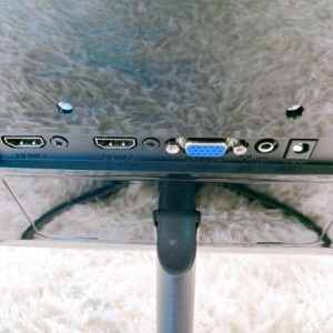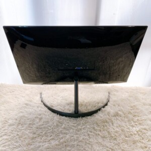 画面表面には通常使用による細かな拭き跡や微細な擦れが見られましたが、映像視聴や作業に支障の出るような大きなダメージはありませんでした。背面やスタンド部分にも軽い使用感は見られるものの、筐体の割れや欠けなどはなく、電源ケーブルも付属しているためすぐに使用可能な状態でした。