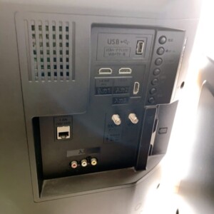 背面には設置時に付いたと思われる軽微な擦れやホコリの付着がありましたが、筐体の割れや破損はなく、テレビとしての基本動作にも問題はありませんでした。HDMI端子やUSB端子などの接続ポートも確認でき、一般家庭での使用には十分な状態でした。