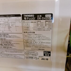 拝見したTWINBIRD 電子レンジ DR-D429は2018年製のモデルで、外装には使用に伴う軽い擦れや小さな汚れが見受けられました。庫内についても多少の使用感はありましたが、大きな焦げ付きや破損はなく、日常使用の範囲内の状態でした。回転皿も付属しており、加熱動作やタイマー操作など基本的な機能も正常に動作することを確認しました。中古家電として再利用可能な状態と判断できる商品でした。