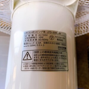 お預かりしたIRIS OHYAMA 扇風機 LFD-306L-Wは2022年製のリモコン式リビング扇風機で、全体的に通常使用に伴う細かな汚れや軽い擦れが見受けられる状態でした。羽根やガード部分には破損や割れはなく、操作パネルや首振り機能、風量調整などの基本動作も問題なく確認できました。リモコンも付属しており、動作確認を行ったところ問題なく使用できる状態でした。中古の季節家電として再利用可能なコンディションの商品でした。