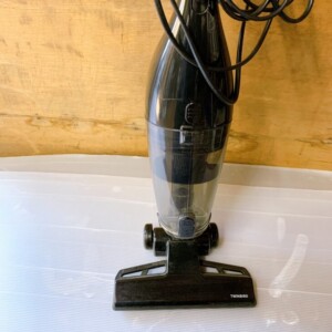 お預かりしたTWINBIRD TC-EA54は、コンパクトで扱いやすいスティック型のサイクロン掃除機です。本体外装には使用に伴う細かな擦れや軽微な汚れが見受けられましたが、大きな破損や欠けはありませんでした。ダストカップ内部にも通常使用による埃の付着はありましたが、吸引動作や電源のオンオフなど基本動作は問題なく確認できました。ヘッド部分のローラーやタイヤも正常に動作しており、日常使用に支障のない状態でした。