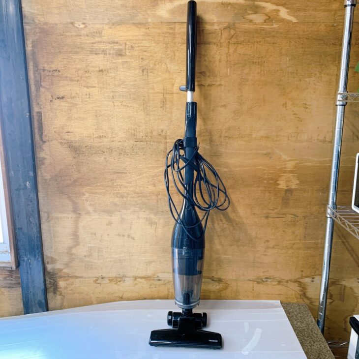 お預かりしたTWINBIRD TC-EA54は、コンパクトで扱いやすいスティック型のサイクロン掃除機です。本体外装には使用に伴う細かな擦れや軽微な汚れが見受けられましたが、大きな破損や欠けはありませんでした。ダストカップ内部にも通常使用による埃の付着はありましたが、吸引動作や電源のオンオフなど基本動作は問題なく確認できました。ヘッド部分のローラーやタイヤも正常に動作しており、日常使用に支障のない状態でした。