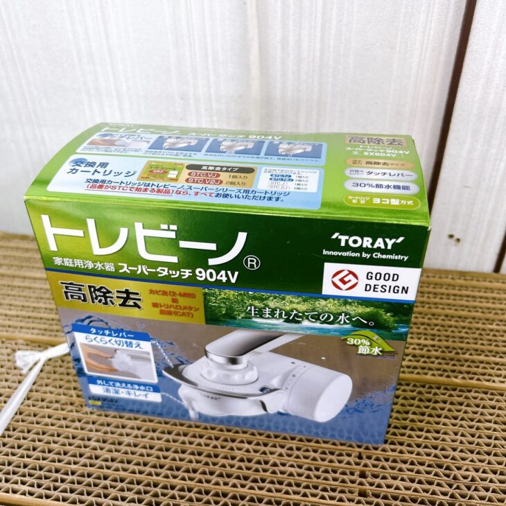 今回お引き取りした商品はTORAY(東レ) トレビーノ スーパータッチ904V 型番SX904Vの家庭用蛇口直結型浄水器です。箱付きの状態で保管されており、外箱には多少の保管スレが見られましたが、本体は未使用に近いきれいな状態でした。