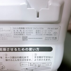 東京都千代田区有楽町へ出張買取 アイリスオーヤマ ふとん乾燥機 カラリエ ツインノズル FK-W1-WP 2020年製 動作良好のため適正価格で査定しました