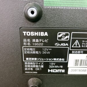 今回査定した商品は東芝 REGZA 液晶テレビ 19S22です。背面ラベルから2019年製の19V型テレビであることを確認しました。
