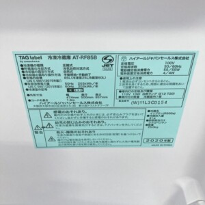 今回査定させていただいた商品はTAG label by amadana 冷凍冷蔵庫 AT-RF85Bです。コンパクトな容量85L(冷蔵室60L・冷凍室25L)の2ドアタイプで、一人暮らし向けの冷蔵庫として中古市場でも需要のあるモデルです。
