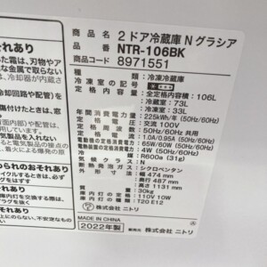 今回お引き取りしたニトリ 2ドア冷蔵庫 NTR-106BKは2022年製の単身向けモデルです。外観には使用に伴う細かな擦れや指紋跡などの使用感が見受けられましたが、大きなへこみや破損などはありませんでした。