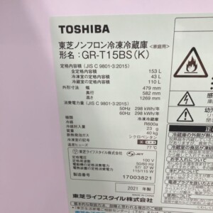 今回は東京都墨田区にお住まいの30代男性(会社員・単身世帯・賃貸マンション)より、東芝 冷凍冷蔵庫 GR-T15BS(K)(2021年製)を出張買取にてご依頼いただきました。