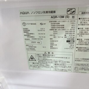 お引き取りさせていただいた商品はAQUA(アクア)2ドア冷凍冷蔵庫 AQR-13M(S)です。全定格内容積は126L(冷蔵室80L・冷凍室46L)で、一人暮らしやコンパクトなキッチンに適したサイズの冷蔵庫になります。