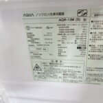お引き取りさせていただいた商品はAQUA(アクア)2ドア冷凍冷蔵庫 AQR-13M(S)です。全定格内容積は126L(冷蔵室80L・冷凍室46L)で、一人暮らしやコンパクトなキッチンに適したサイズの冷蔵庫になります。
