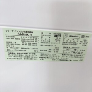 ご依頼いただいた商品はSHARP(シャープ)2ドア冷凍冷蔵庫 SJ-D15K-Hです。容量は152L(冷蔵室94L・冷凍室58L)で、一人暮らしやコンパクトなキッチンに適したサイズの冷蔵庫です。