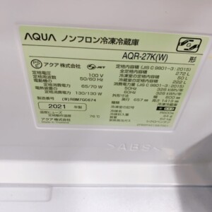 今回は東京都世田谷区等々力にお住まいの40代女性(主婦・夫婦世帯・持ち家〈マンション・分譲マンション〉)のお客様より、AQUA ノンフロン冷凍冷蔵庫 AQR-27K(W)(2021年製)を出張買取にてご依頼いただきました。