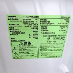 今回は東京都新宿区にお住まいの30代男性・会社員(単身世帯)より、comfee ノンフロン冷凍冷蔵庫 RCT90BL(E)(2024年製)を出張買取にてご依頼いただきました。容量90Lのコンパクトタイプで、ワンルームや学生寮などの一人暮らし向け家電として流通の多いモデルです。省スペース設計で設置しやすく、サブ冷蔵庫やオフィス用としても利用されることの多い小型冷蔵庫です。
