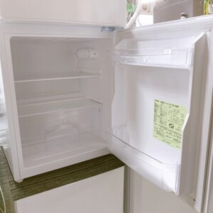 外観には目立つ傷やへこみは見受けられず、使用による軽微な擦れ程度で全体としてきれいな状態でした。庫内の棚やドアポケットも揃っており、冷却動作も問題なく確認できました。冷凍室の製氷トレーも残っており、付属品がしっかり残っている点も評価できる状態でした。