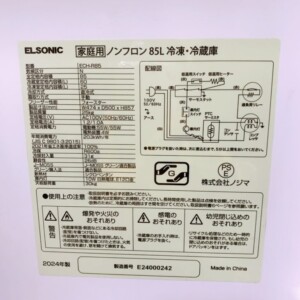 お預かりした商品はELSONIC(エルソニック)家庭用ノンフロン冷凍冷蔵庫 ECH-R85で、2024年製の比較的新しいモデルでした。容量は85Lで、冷蔵室60L・冷凍室25Lの2ドアタイプです。