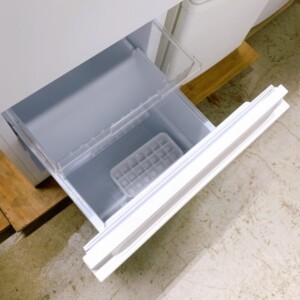 外観は全体的に清潔感があり、目立つ傷やへこみは見当たらず良好な状態でした。庫内の棚やドアポケットも揃っており、冷凍室の引き出しや製氷トレーも残っていました。庫内もきれいに使用されており、動作確認でも冷却機能に問題はありませんでした。