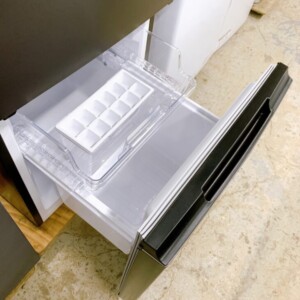 外観は落ち着いたグレーカラーで、目立つ傷やへこみは見受けられず全体的にきれいな状態でした。庫内も清潔に使用されており、ガラス棚・ドアポケット・野菜ケースなどのパーツも揃っていました。冷凍室の引き出しや製氷トレーも残っており、動作確認でも冷却機能に問題はありませんでした。